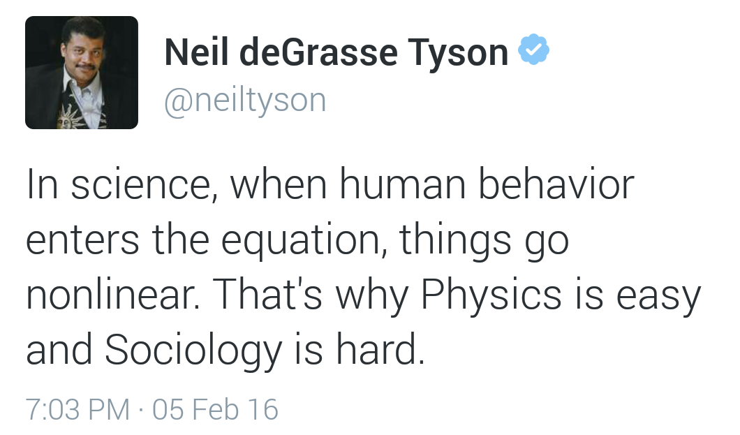 When I’m introducing my discipline to college students I often quip that if sociology were easy, physicists would do it. After all, physics is guided by natural laws that do not deviate, for which there are no exceptions. A particle, being accelerated around a huge magnetic ring until collided with another particle will act in certain, mathematically predictable ways.