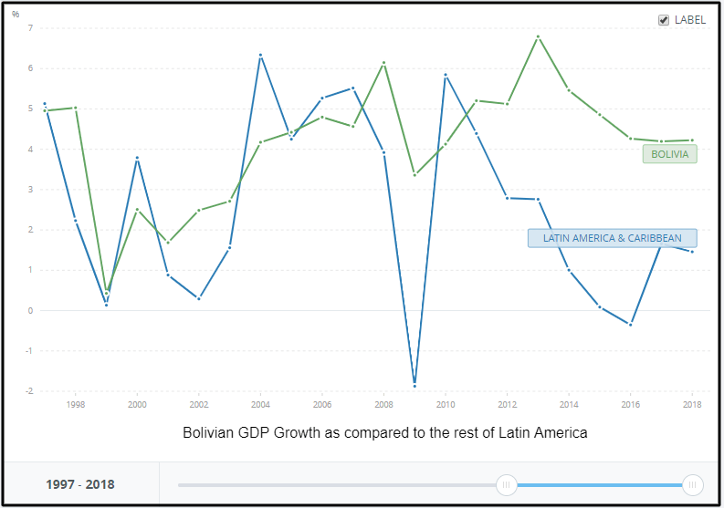 The results are clear. In 2018, Bolivia was the fastest growing economy in South America [see note]. Poverty fell by around 60%. Millions of Bolivians moved into the middle class. Unemployment is comparable to that of the United States. Bolivians enjoyed unprecedented improvements in their standard of living, with improved access to education, health care and housing. Bolivia has moved from a Latin American backwater to an instrumental partner in the global economy.