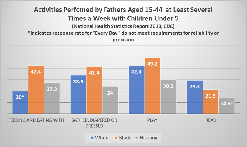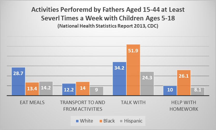 To demonstrate, I took the data from the tables at the end of the National Health Statistics Report 2013, the source most often cited from what I’ve seen. I looked at the race comparisons for key indicators of participant fatherhood. I then combined the numbers under the categories “Several Times a Week” and “Every Day” under a single column “At Least Several Times a Week”. The results are revealing.