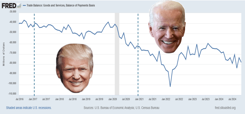 Then there’s trade. The Art of the Spiel specialist claims that he’s all about the business deal and nobody can get a better deal than him…except when it comes to steaks, and universities, and casinos, and Bibles…well what I’m saying is, his pet pony is trade. For MAGA, this means having a trade surplus because our surplus is a win, and a deficit is a loss. The former president never quite got to a trade surplus, but his deficit was lower than Biden’s–but higher than Obama’s (Shhh)