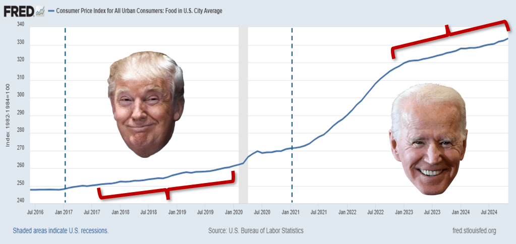Of course, it wasn’t inflation in and of itself. Americans were especially upset about food prices…the price of bacon! That food inflation was largely under control in the last year of Biden’s term never hit home with many Americans because, slower inflation does not mean that prices are coming down. It just means they are not going up as fast. Little Hands swore that he would Make American Groceries Affordable Again. He has since backed off of his promises…after people voted for him, of course.