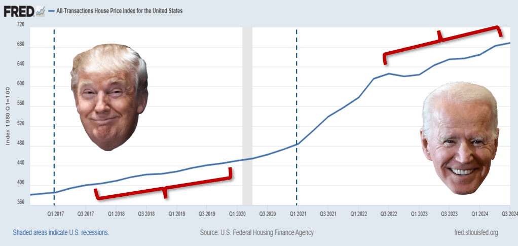 Housing was a huge problem for the Biden and then the Harris campaign. Harris had a proposal. Her opponent’s proposal was to deport brown people and put their empty houses on the market. Of course, those same brown people are the ones who build the houses…