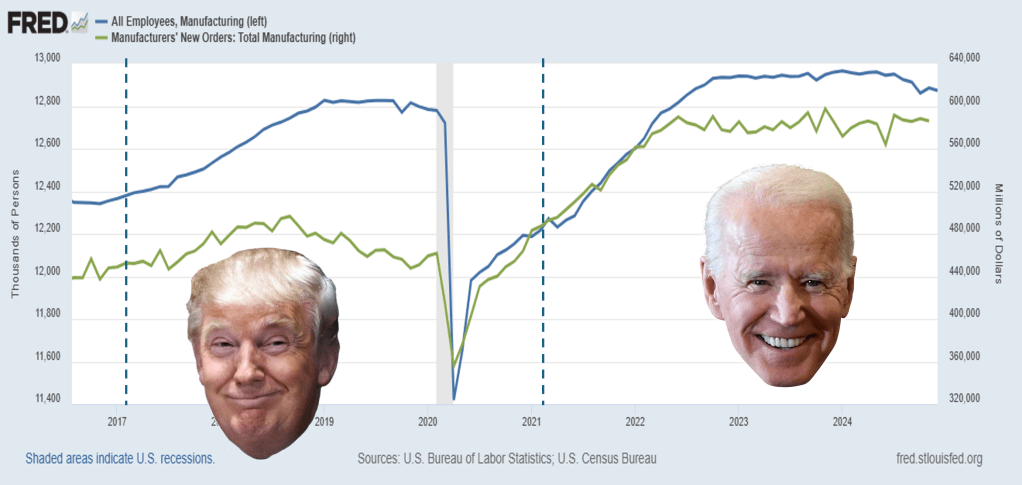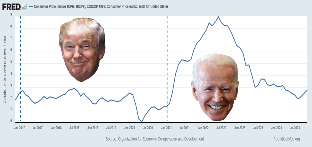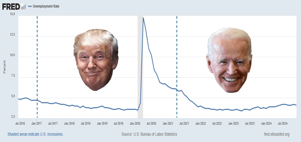 The reality is that for the standards of the Neoliberal Era and considering the fact that we went through an inflationary spike that lasted a couple of years, the United States economy has looked pretty good. Indeed, it’s the envy of the advanced world. President Theyletmedoit has promised that he can do better. In 2017, he inherited a solidly growing economy and did not screw it up. He also didn’t improve on it. He made some minor changes and slapped a new name on it, (NAFTA/USCMA). The truth is that the economy that Biden inherited was destabilized by the pandemic but was largely the same economy that his predecessor inherited. This was not good news to Americans who had to weather the inflationary spike only to find themselves in the same precarious position they were in before the pandemic.