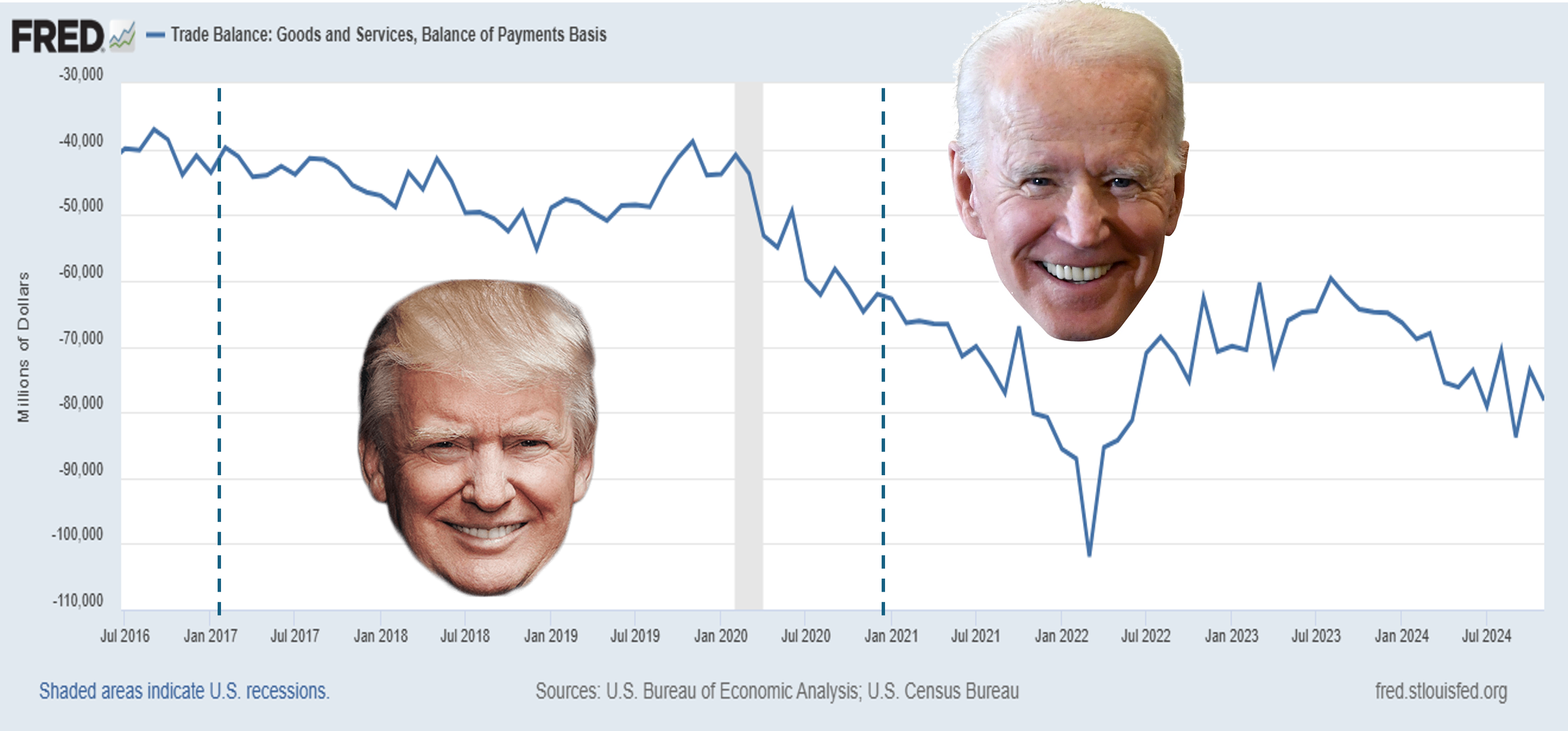 Then there’s trade. The Art of the Spiel specialist claims that he’s all about the business deal and nobody can get a better deal than him…except when it comes to steaks, and universities, and casinos, and Bibles…well what I’m saying is, his pet pony is trade. For MAGA, this means having a trade surplus because our surplus is a win, and a deficit is a loss. The former president never quite got to a trade surplus, but his deficit was lower than Biden’s–but higher than Obama’s (Shhh)