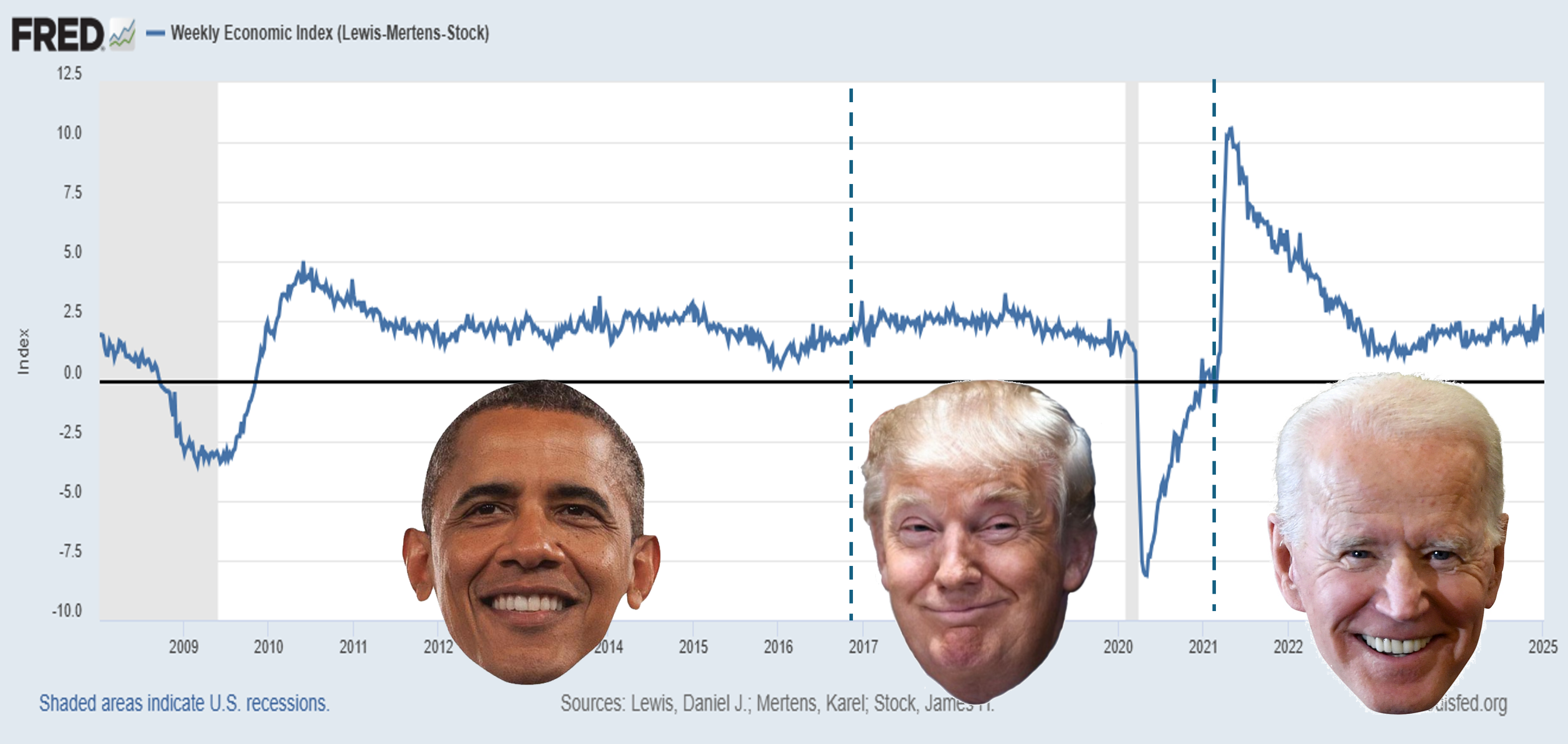 The truth is that since the Great Recession, with the exception of the Recession/Recovery and the Pandemic/Inflation, the economy has not changed. A rough graphic of this is the Weekly Economic Index which combines ten different measures in an attempt to snapshot the economy as a whole. If there is a problem that helped get the Pussy Grabber re-elected, it is this fact. Every president runs on economic change. The economy is oppressive to the vast majority of us, so we want change…but it doesn’t change.