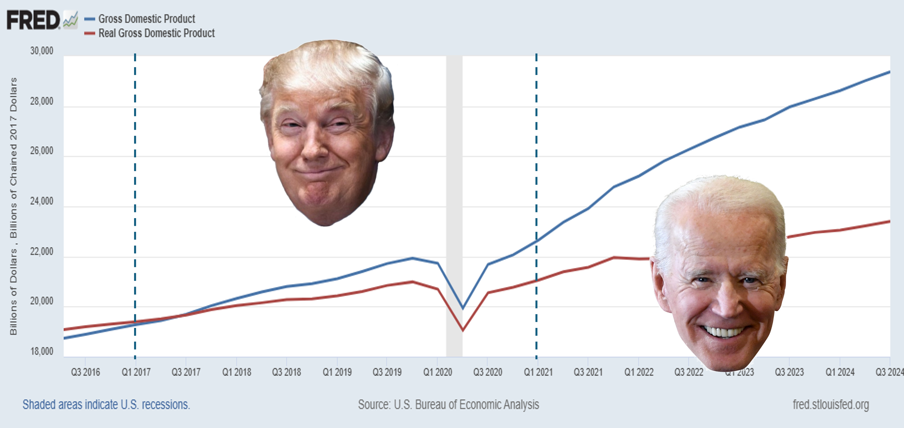 In 2017, the incoming President inherited a growing economy. We tend to say that he inherited this economy from the previous president, but the truth is that presidents have very little to do with the economy. Regardless, that economy continued to grow at more or less the same rate until the COVID Pandemic forced us to prioritize human health and life over profit margins…much to the chagrin of many on the right.