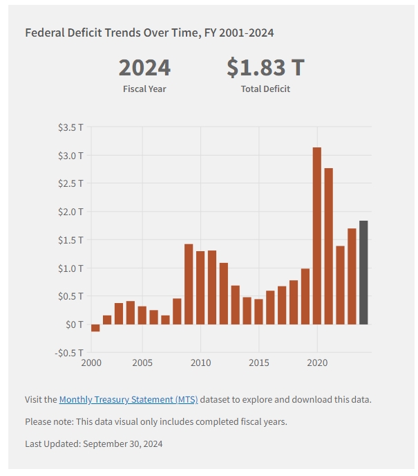 We can’t forget that we have to pay for stuff. The incoming administration has put its faith in Co-President Muskaswammy to balance the budget. Of course, we know that balancing the budget is really a challenge when people like Muskaswammy don’t want to pay more into the budget. That means cuts. Not to worry, President Muskaswammy is going DOGE and assure us that they can balance the budget simply by cutting waste. That being said, what a working person considers wasteful and what a billionaire social media troll considers wasteful may be two different things. Regardless, the deficit has been increasing, much of it driven by the 2017 Budget, but also Biden’s spending priorities. Will Muskaswammy save us from our own reckless spending?