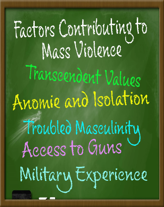 My brother, an ardent gun-rights advocate, and I had an ongoing debate for years. This debate encouraged me to do a deep dive into the research on gun-control and mass shootings. Many of these debates became essays on the Mad Sociologist Blog under the Gun Control Category. By the end of 2015 I was approaching a general theory of mass shootings and mass violence in general. The first step was getting past the parameters of the debate involving Good Guys vs. Bad Guys with Guns. In 2016 I wrote a summary of my observations on the cause of mass shootings. These four factors, Transcendent Values, Anomie and Isolation, Troubled Masculinity, and Access to Guns have been consistent contributors to mass violence ever since.