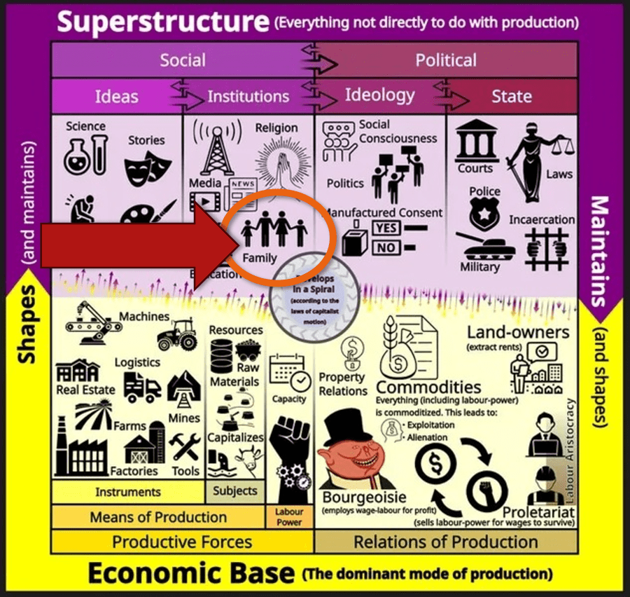 The best example of this is Karl Marx’s concept of the Superstructure.9 Marx saw society as resting on economic foundations, presided over by an economic elite. This economic elite uses its wealth to fund and finance other structures like the state, education, religion and culture. These structures, form a superstructure that supports the legitimacy of the economic elite. This superstructure teaches the proletariat, from the soapbox, the classroom, or the pulpit, that capitalism is the right and natural way to run a society. For Marx, this superstructure creates an alienating False Consciousness that keeps the proletariat from rising against its oppressors.