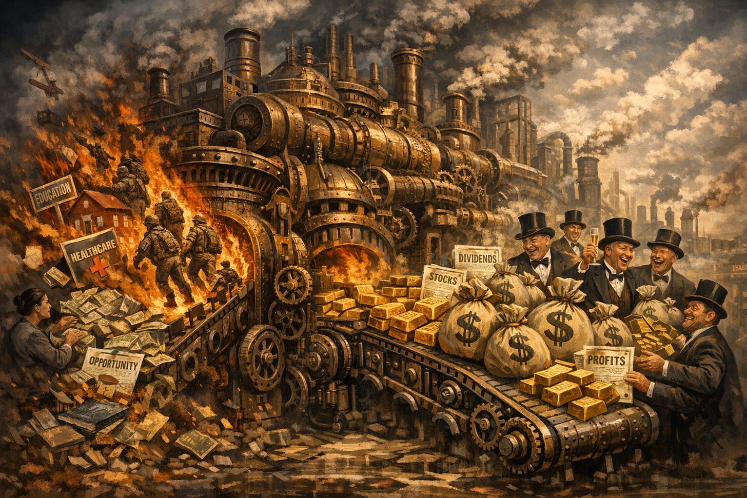 If we really need to use this monstrous War Machine, then the keepers of this War Machine—the real keepers—should be more than happy to pay the cost of doing so. The system as designed creates a moral hazard by which the Epstein class profits handsomely from the entering into risks the rest of us are forced to pay. If blowing up hospitals and schools is so important, so imperative, let’s make sure that the Keepers of the Machine have real skin in the game.