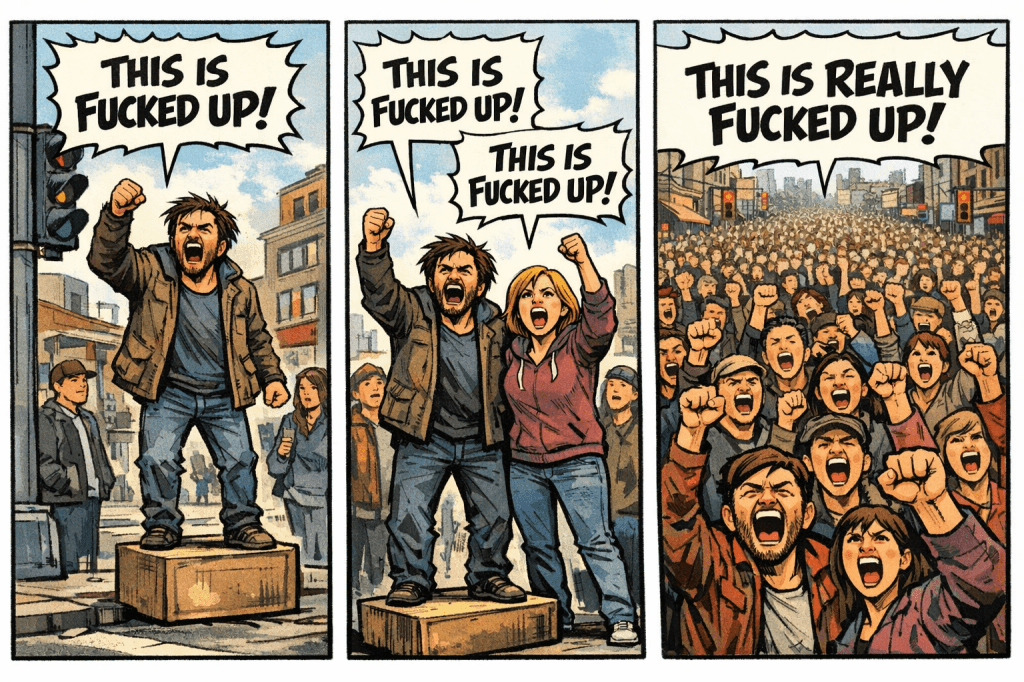 Collective action in the form of public protest rarely inspires the power elite to change or even to implement a single policy. It does, however, announce that the notion that “this is fucked up!” is there and has some level of popular support. It’s not just scattered singular individuals who believe “this is fucked up.” The street protest is an announcement to those in power that we see what’s going on, and it matters. More importantly, it’s an announcement to the world that if you believe “this is fucked up!” you are not alone. There are others like you out there ready to reach out. They are ready to take to the streets. Come and join us! The power elite ignores this, and to be honest they almost always ignore this, at their own peril.